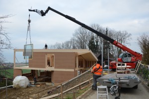 - 15.02.16 Le mur nord est posé, il reste suspsendu en attendant qu’il soit vissé.